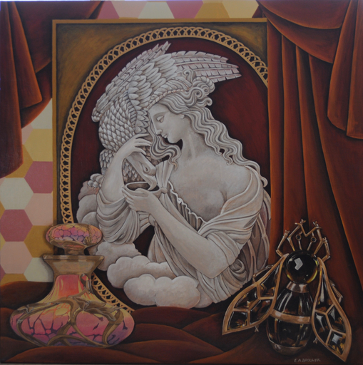 Momenteel ben ik bezig met een serie genaamd Cameo's: een serie bestaande uit (Mythologische) figuren, meest Griekse godinnen, afgebeeld als camee. Een camee is een sierraad gesneden uit (meestal) een schelp. Om deze camee schilder ik voorwerpen zoals draperieën, flesjes, andere sierraden of voorwerpen die voorkomen in het mythologische verhaal van de afgebeelde figuur op de camee. Ook deze schilderijen zijn geschilderd met acrylverf op doek en afgelakt met 2 lagen lak.